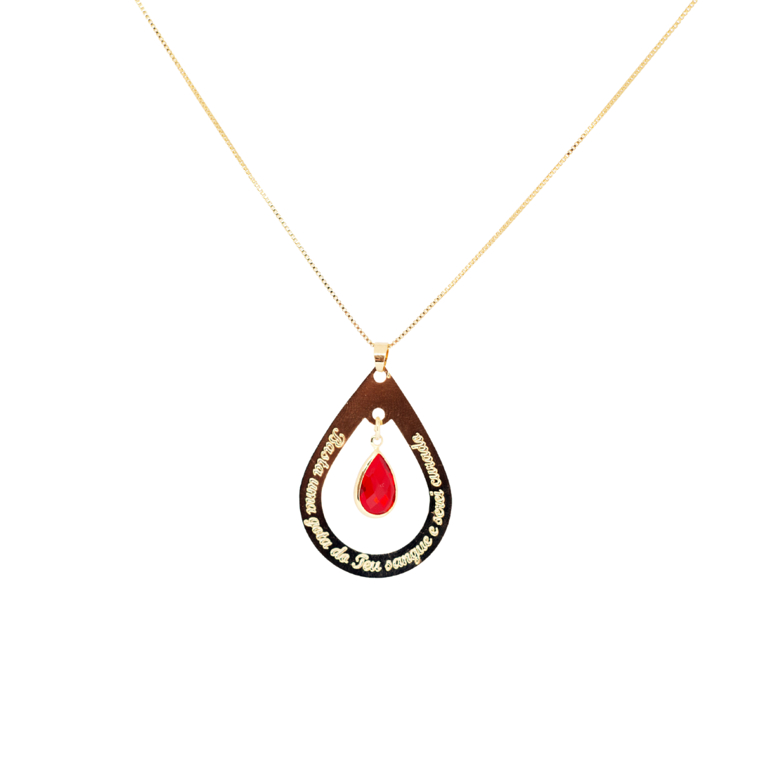AA1278Colar com design vazado em forma de gota, traz gravado um verso da música do Padre Reginaldo Manzotti: "Basta uma gota do Teu sangue". A peça é adornada com uma pedra de vidro lapidado, combinando elegância e significado. Uma semijoia única, perfeita para expressar sua fé.