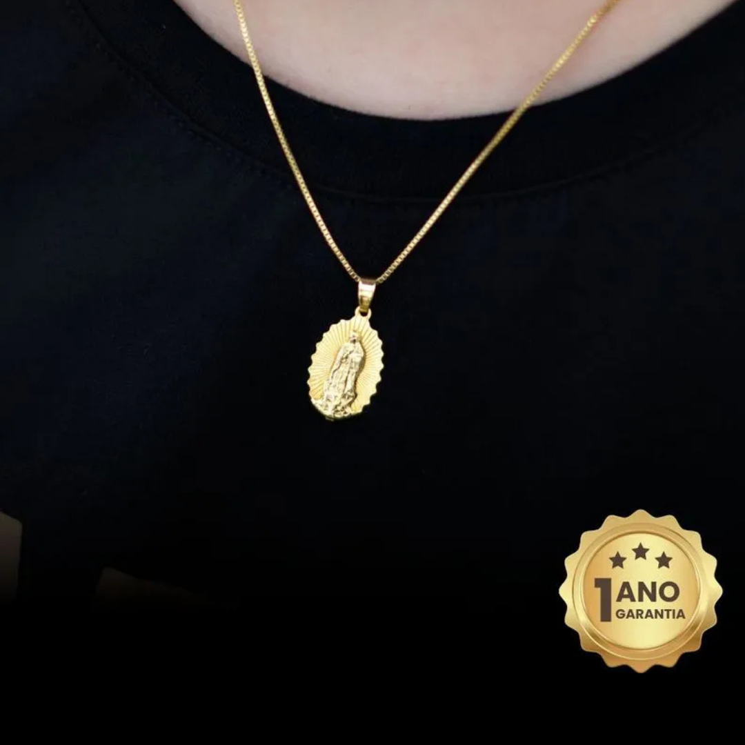 AA1296Colar folheado a ouro com medalha de Nossa Senhora de Guadalupe. Design sofisticado, brilho duradouro e 1 ano de garantia. Uma joia de fé e elegância para qualquer ocasião.