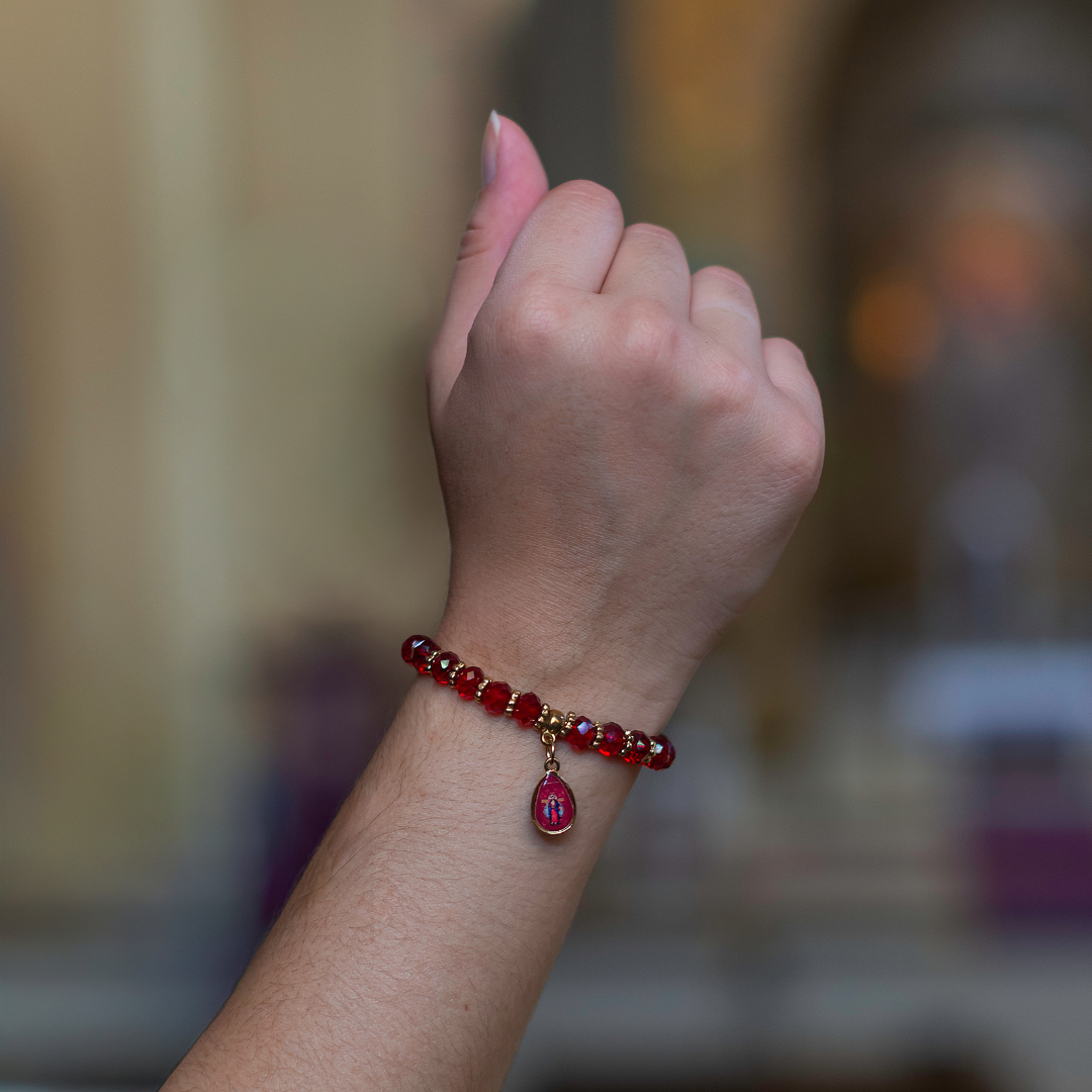 Pulseira Jesus das Santas Chagas Confeccionada em metal comum com contas em cristal sintético e detalhes em resina, possui elástico de silicone que proporciona praticidade e conforto ao vestir. O modelo se adapta facilmente ao pulso, sendo ideal para o uso diário. Conta com pingente em formato de gota com a imagem de Jesus das Santas Chagas, trazendo um toque de fé e significado à peça. Detalhes do produto: Cor: Vermelho e dourado Material: Metal comum, contas de cristal sintético, elástico de silicone e resina Diâmetro: Aproximadamente 11 cm Leve, confortável e ideal para uso diário