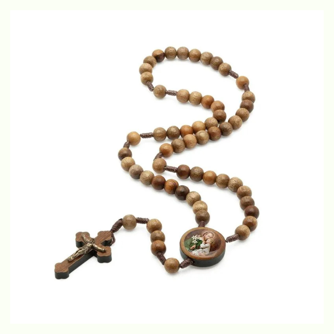 TB8545O Terço São José em Madeira é um instrumento de oração que reflete a simplicidade, a fé e a perseverança vividas por São José. Confeccionado com contas em madeira e detalhes delicados, ele une beleza e significado espiritual, tornando cada momento de oração ainda mais especial.